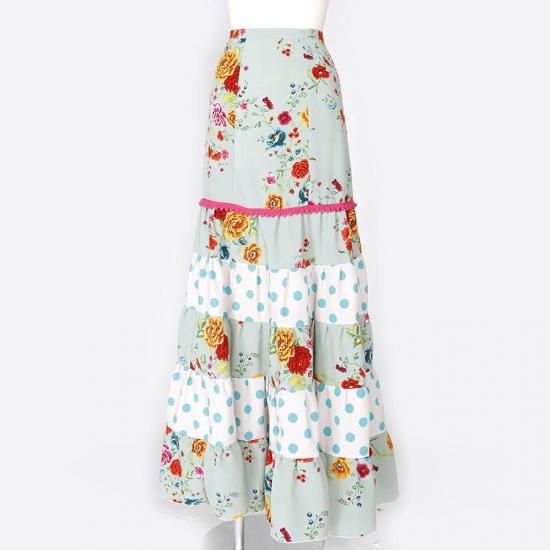MF2011ティアードスカート<lantana >ライトグリーン花柄・水玉<☆1点もの☆>L-100